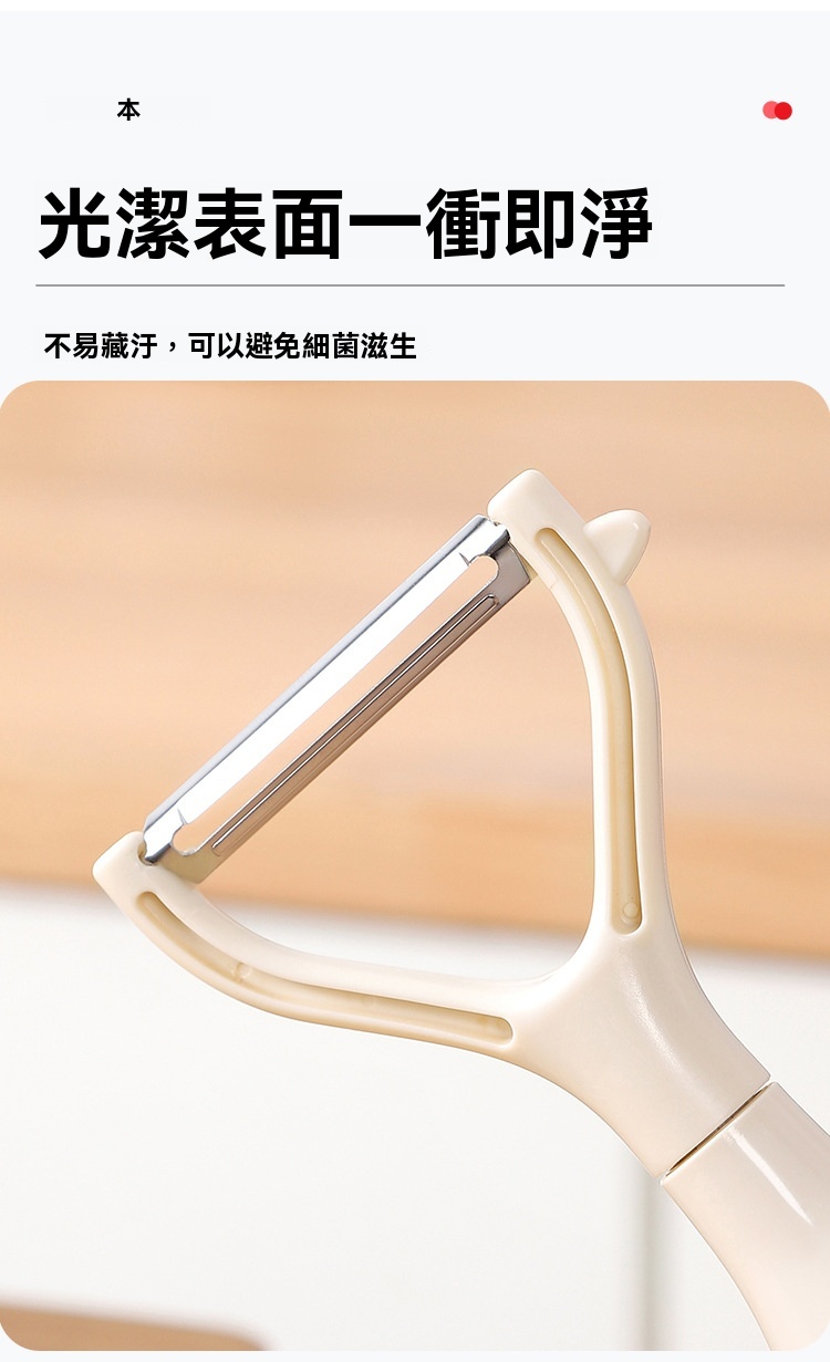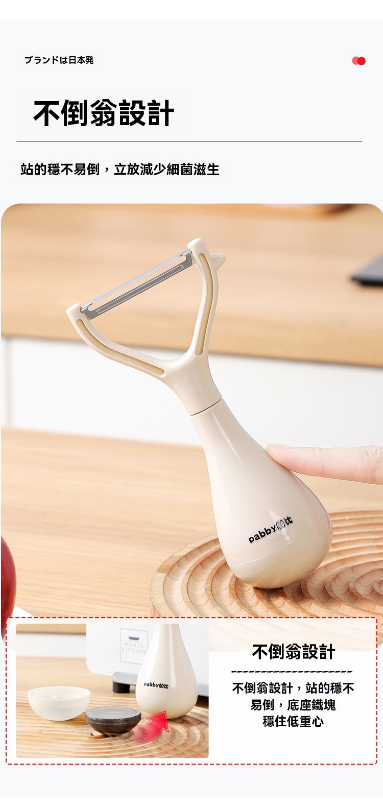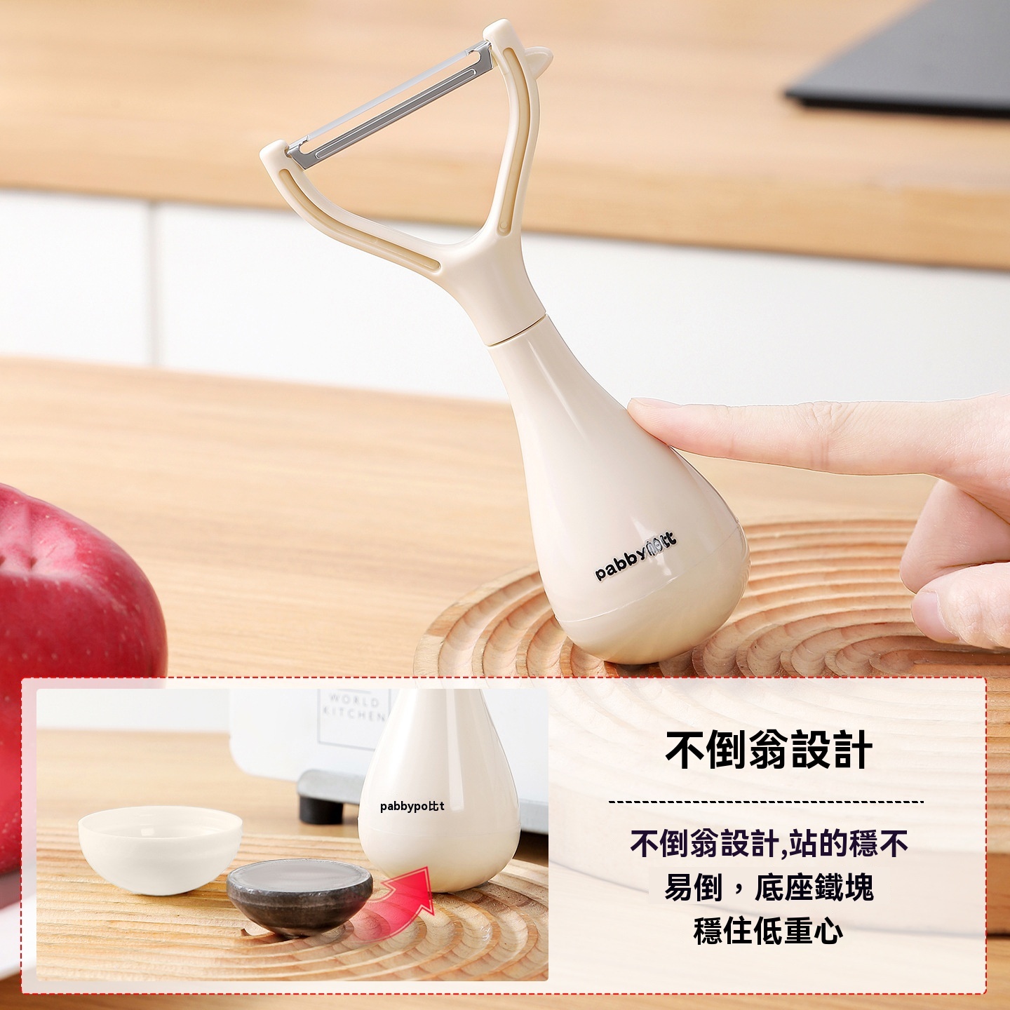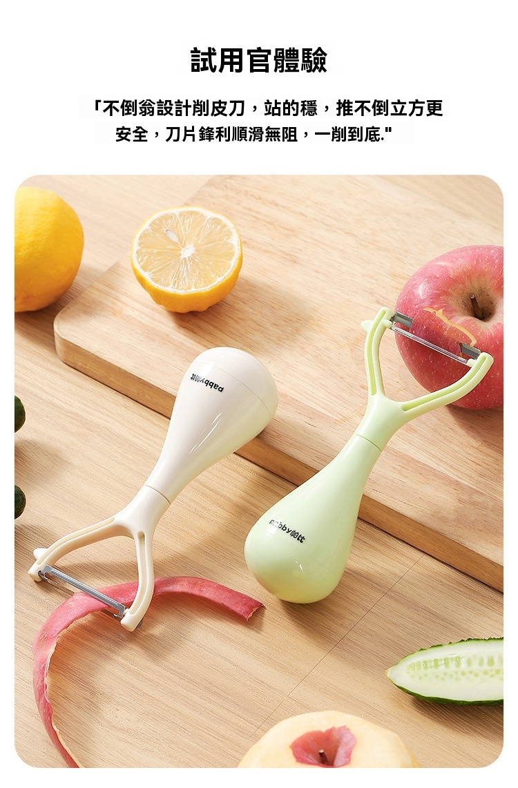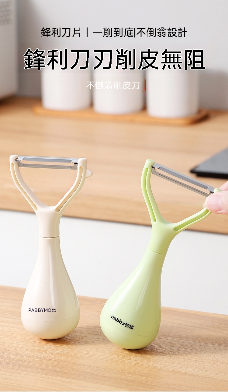 超薄鋒利刀片,削皮薄且快,不浪費果肉,馬鈴薯蘋果輕鬆削,不倒翁立式設計,用完隨手放,不沾檯面,瀝乾水分更衛生