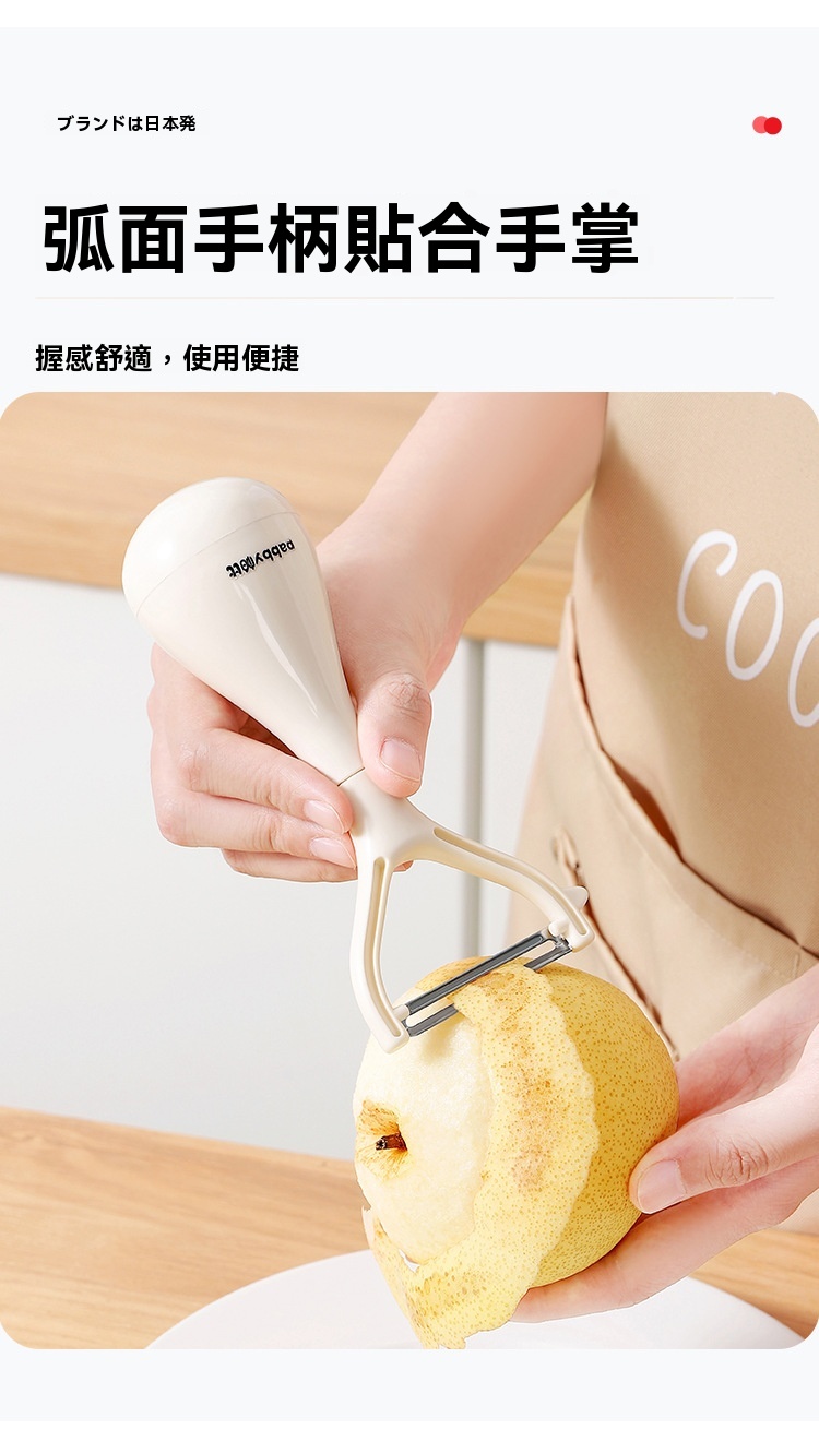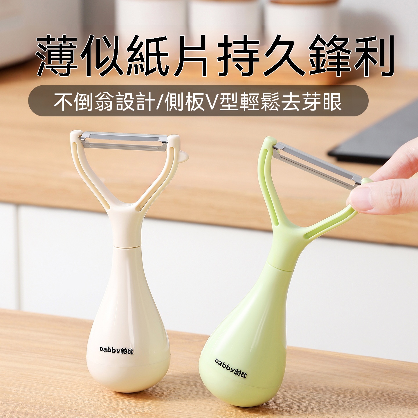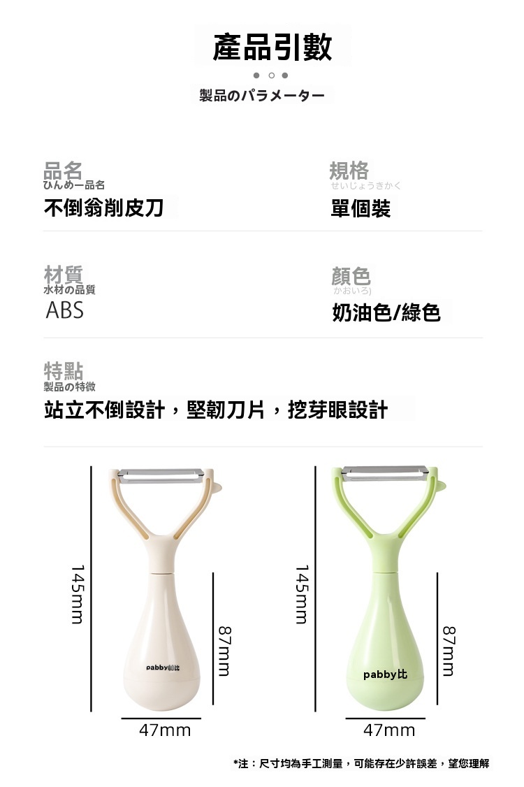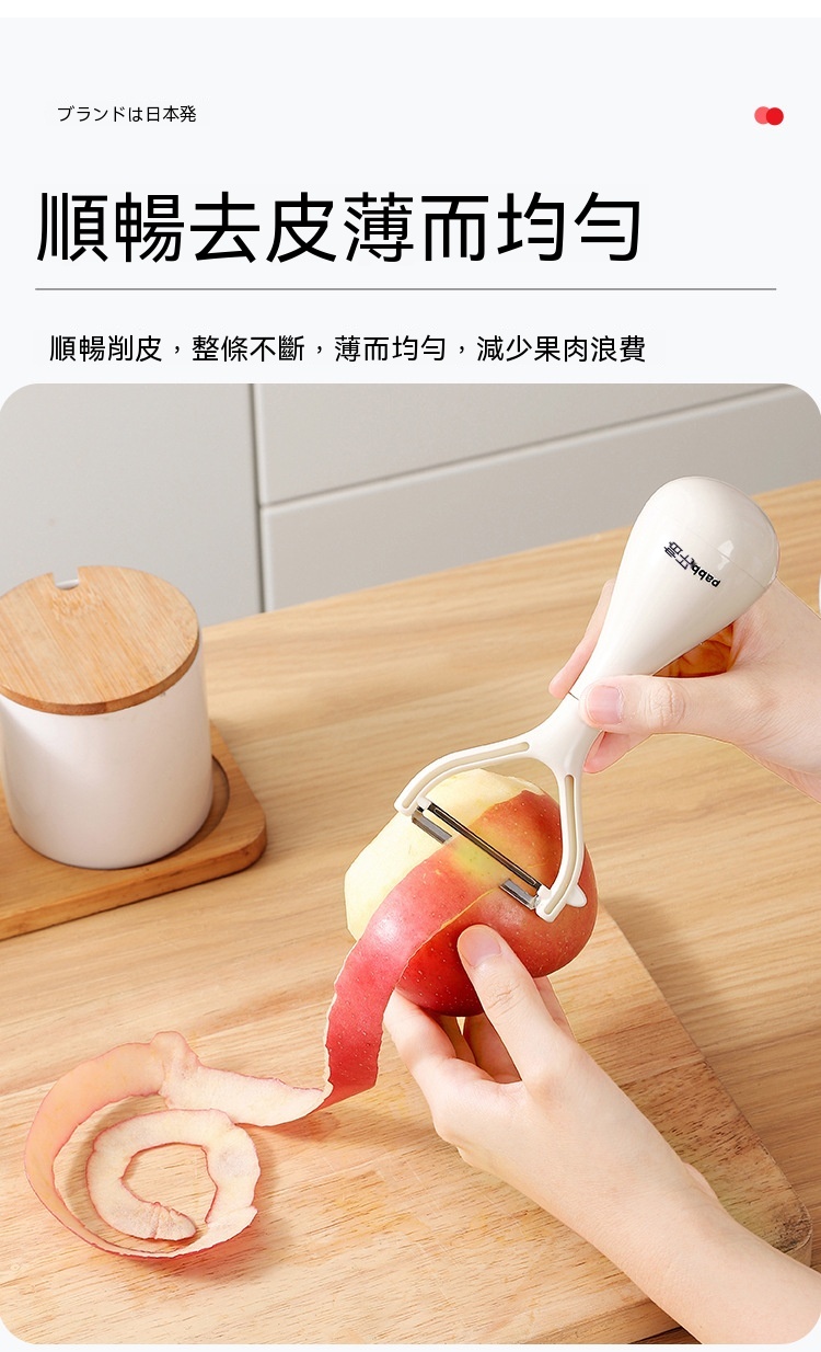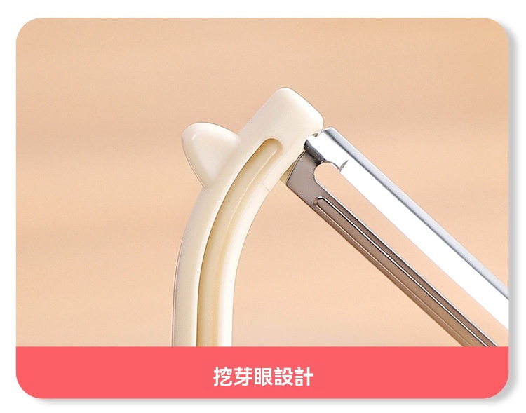 超薄鋒利刀片,削皮薄且快,不浪費果肉,馬鈴薯蘋果輕鬆削,不倒翁立式設計,用完隨手放,不沾檯面,瀝乾水分更衛生